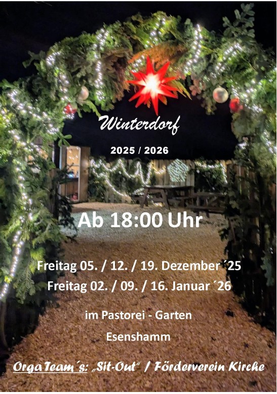 Der Förderverein der Esenshammer Kirche e.V. hat in diesem Jahr wieder ein Winterdorf in Esenshamm hergerichtet. Am 3. Adventswochenende ging es zunächst am Samstag, 14.12. mit Orgelklang in der Kirche los, um anschließend bei Pommes, Bratwurst und Getränken den Abend ausklingen zu lassen. Am Sonntag wurde dann nach einer Andacht in der Kirche ein kleiner Basar in der Pastorei veranstaltet, um noch die letzten Weihnachtsgeschenke kaufen zu können. Nebenbei konnte sich noch ein Tannenbaum ausgesucht, dem Nikolaus „Moin“ gesagt und im Winterdorf verweilt werden.