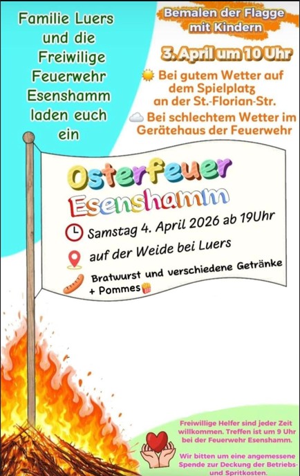 Am Samstag, 04.04.2026 ab 19:00 Uhr veranstaltet die freiwillige Feuerwehr und Familie Luers das alljährliche Osterfeuer – Bei Bratwurst, Pommes, Stockbrot und kühlen Getränken haben die Bürger*innen von Esenshamm wieder einen super Treffpunkt, um sich auszutauschen und einen tollen Abend zu haben. Und für die Kinder ist es sowieso ein aufregendes Abenteuer mit Feuer und co! Vielen Dank an dieser Stelle an Familie Luers und die Freiwillige Feuerwehr, die sich jedes Jahr so viel Mühe mit der Organisation und Planung geben.