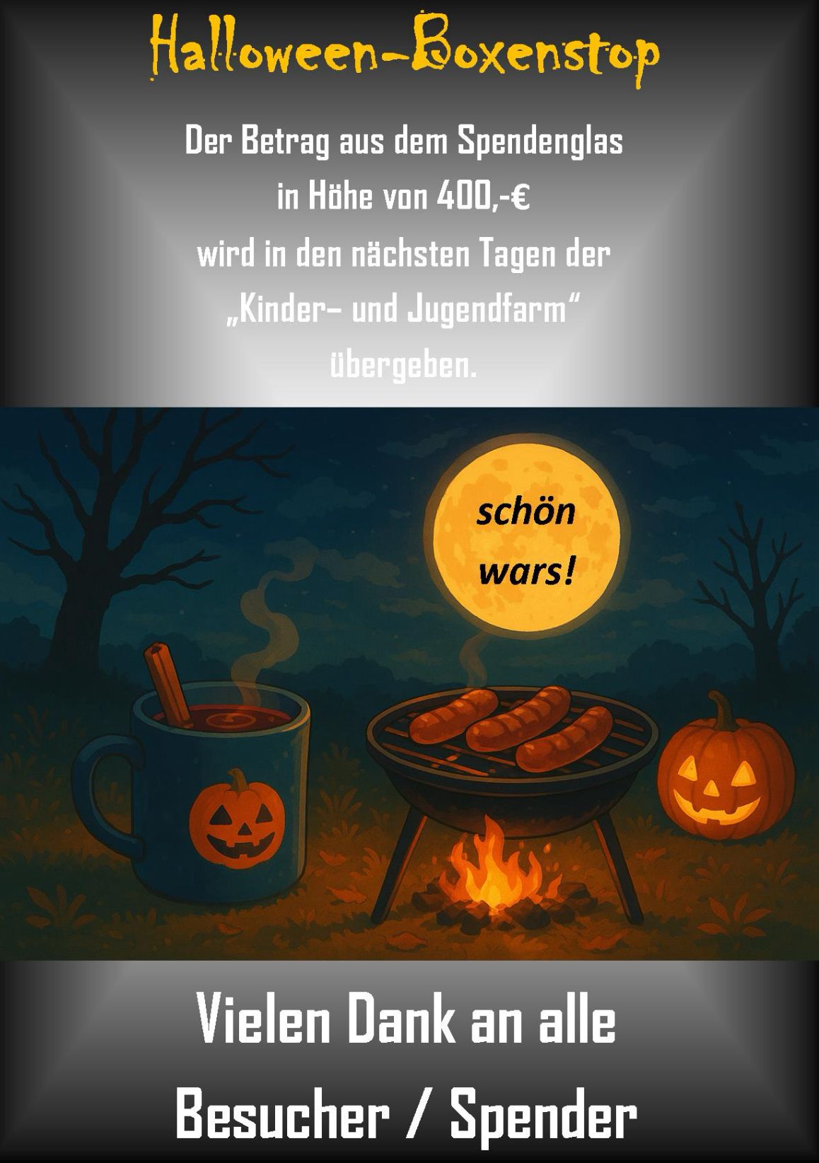 Dieses Jahr zu Halloween konnte zum ersten Mal ein Halloween-Boxenstop bei der „Dorfhexe Anke mit Gefolge“ gemacht werden, um sich für den Süßigkeiten-Marathon mit Heiß- und Kaltgetränken sowie Bratwurst zu stärken. Das Ganze fand in der Heubergsiedlung statt und wurde richtig gut angenommen. Insgesamt 400,00€ Spenden konnten für die Kinder-und Jugendfarm gesammelt werden. Wenn das nicht mal eine coole Aktion war!